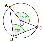 ∠ABC = 75o ∠AOC = 150o ${\stackrel \frown {AC}}$ = 150o ${\stackrel \frown {ABC}}$ = 210o |